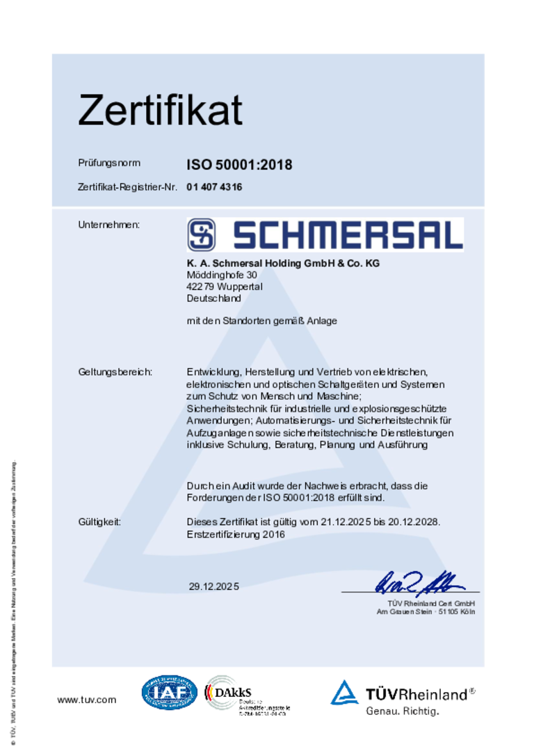 All production subsidiaries of the Schmersal Group work on the basis of a quality management system which is certified in accordance with DIN EN ISO 9001. The QM system is modular in design and sets out clear rules for all processes and workflows within the company.